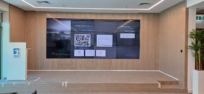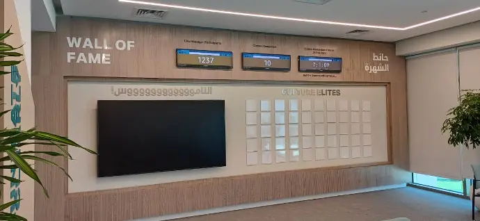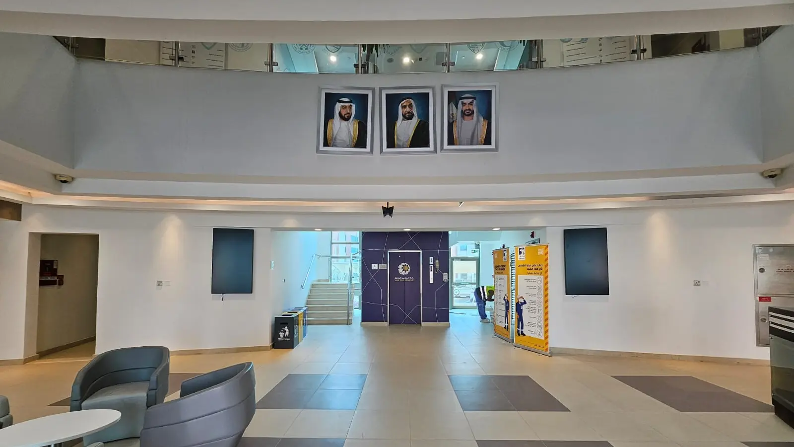 Upgrades on the 2nd floor hall included a wooden bench with fabric, a wooden backdrop panel, a wooden stage, and a podium. Wood veneer finish wall cladding was also installed. Mechanical works included A/C ducting, and electrical works included the installation of electrical floor and wall boxes, lights, and programming light sensors. Graphics were updated, and a smoke detector was installed.