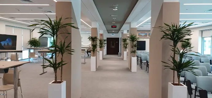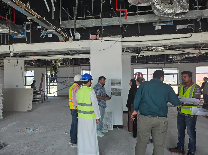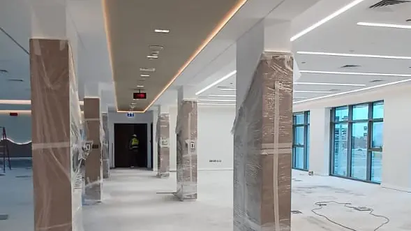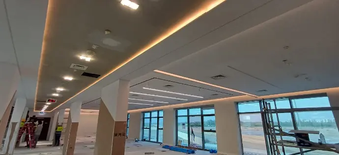 The rehabilitation project included extensive refurbishments and installations on the ground and 2nd floors. This involved removing the old ceiling, frames, and gypsum and glass partitions, followed by installing an 18mm fire-rated gypsum ceiling with an aluminum frame.